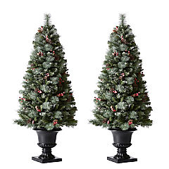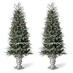 Glitzhome Set of Two 5ft Pre-Lit Flocked Pine Artificial Christmas Porch Tree with 130 Warm White Lights