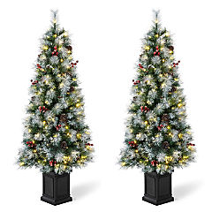 Glitzhome Set of Two 5FT Pre-Lit Flocked Fir Artificial Christmas Porch Tree with 150 Warm White Lights and Red Berries