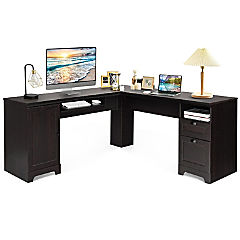 Costway L-Shaped Corner Computer Desk Writing Table Study Workstation w/ Drawers Coffee