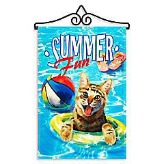 G128 Combo Set: Garden Flag Hanger AND Garden Flag Summer Fun with Cat in Pool 12"x18