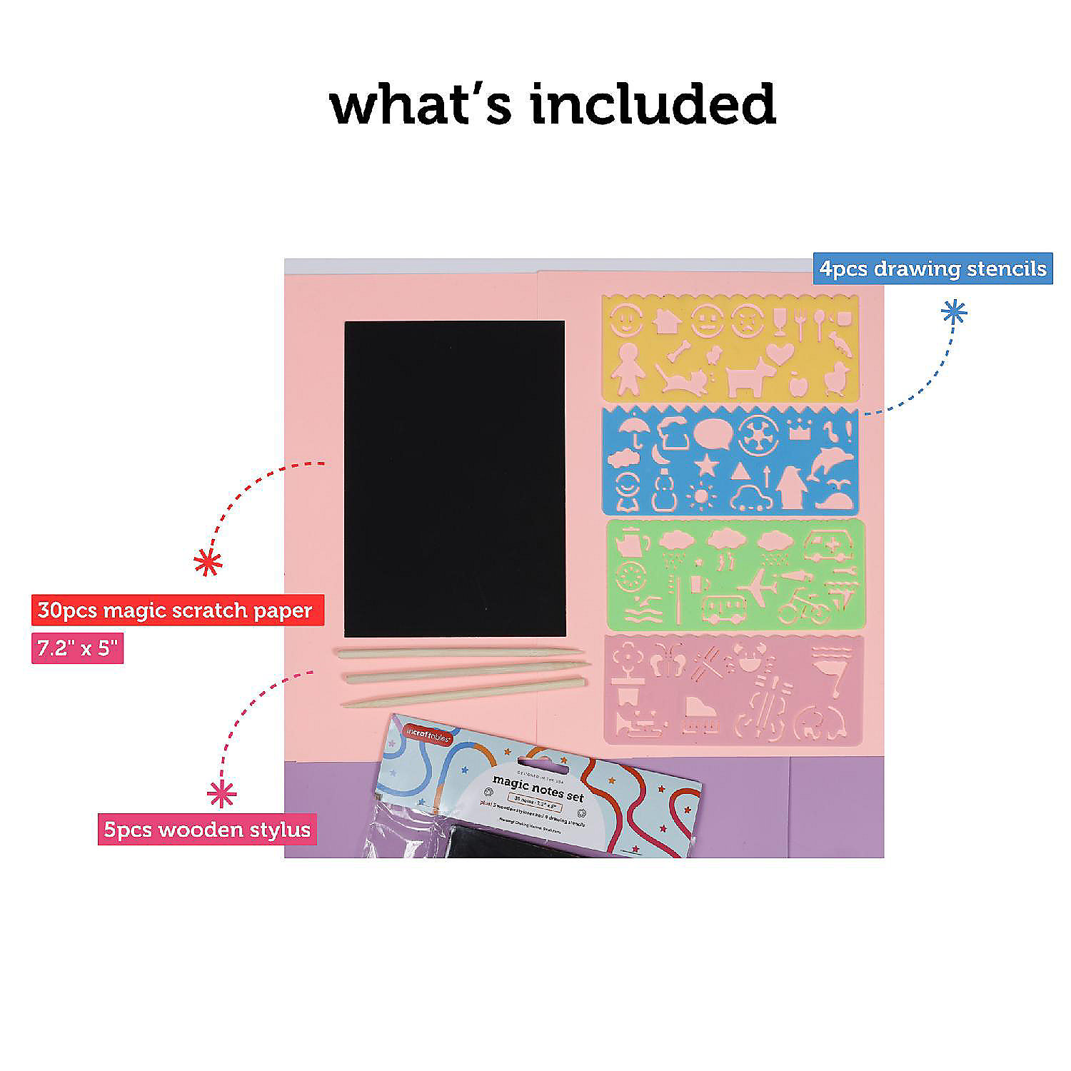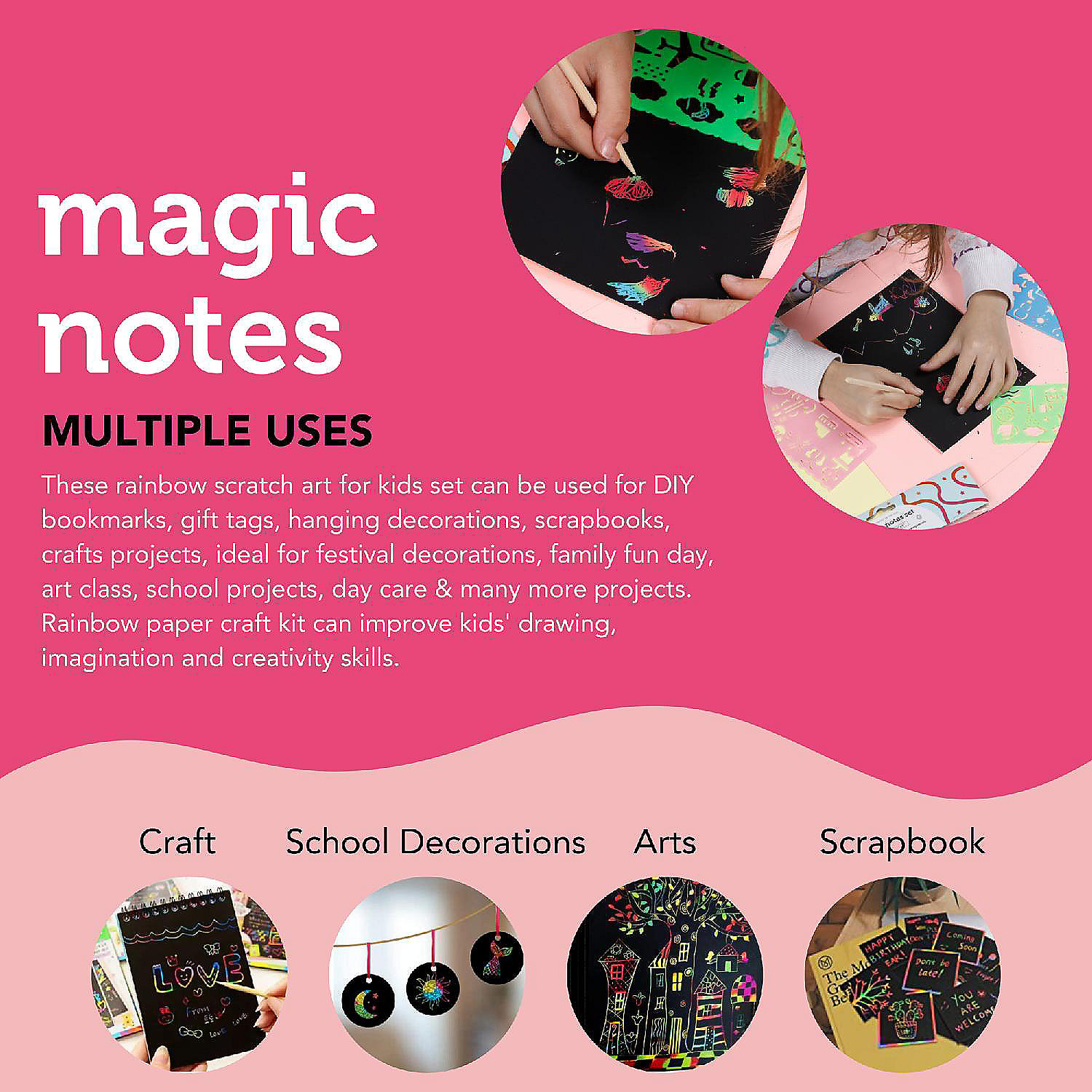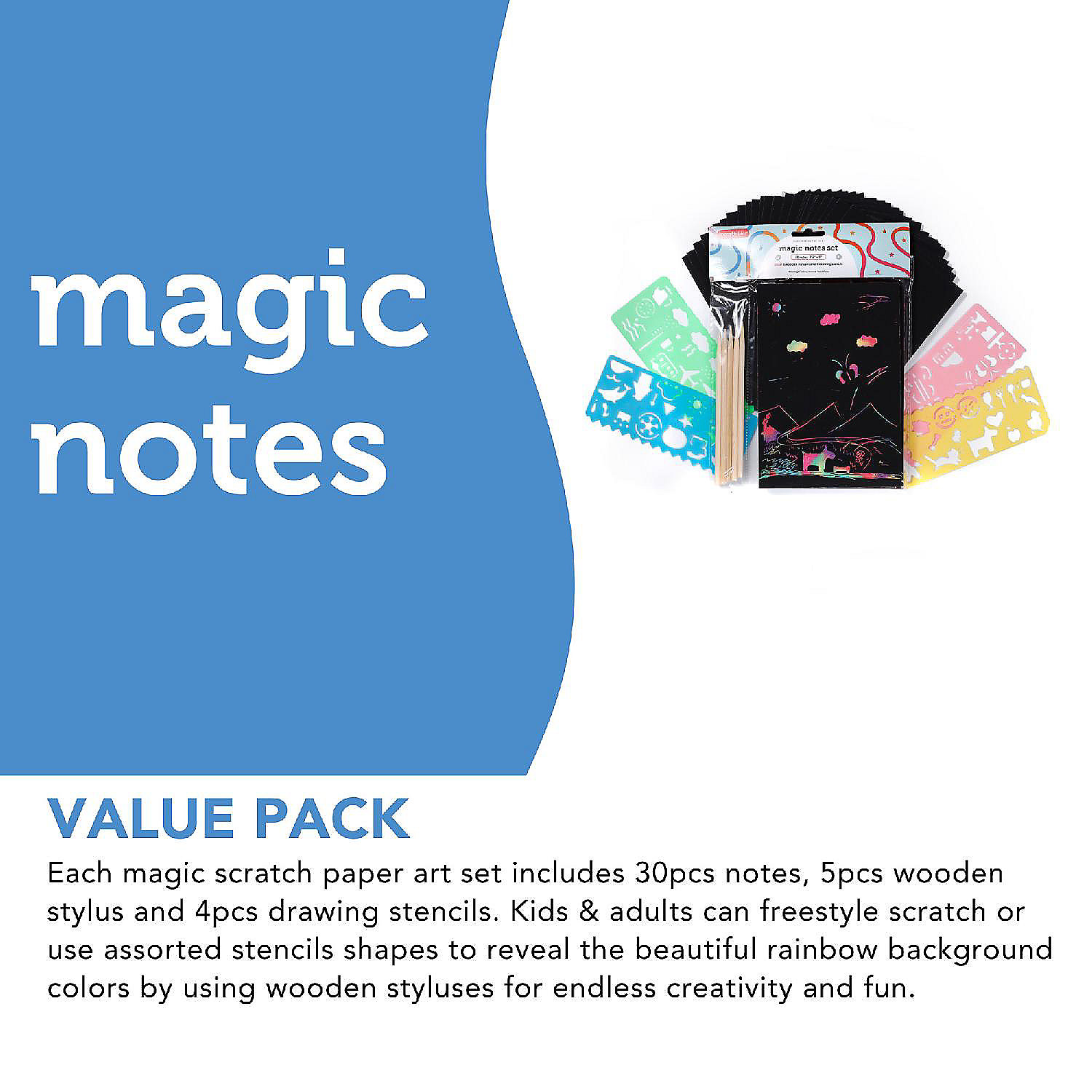 VALUE PACK: Each scratch paper art set includes 30pcs notes, 5pcs wooden stylus and 4pcs drawing stencils. Kids & adults can freestyle scratch or use assorted stencils shapes to reveal the beautiful rainbow background colors by using wooden styluses for endless creativity and fun.MULTIPLE USES: These rainbow scratch art for kids set can be used for DIY bookmarks, gift tags, hanging decorations, scrapbooks, crafts projects, ideal for festival decorations, family fun day, art class, school projects, day care & many more projects. Rainbow paper craft kit can improve kids' drawing, imagination and creativity skills.