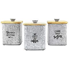 AuldHome Design Farmhouse Galvanized Canisters (Set of 3); Storage Containers for Coffee, Tea and Sugar in Galvanized Iron and Wood Design