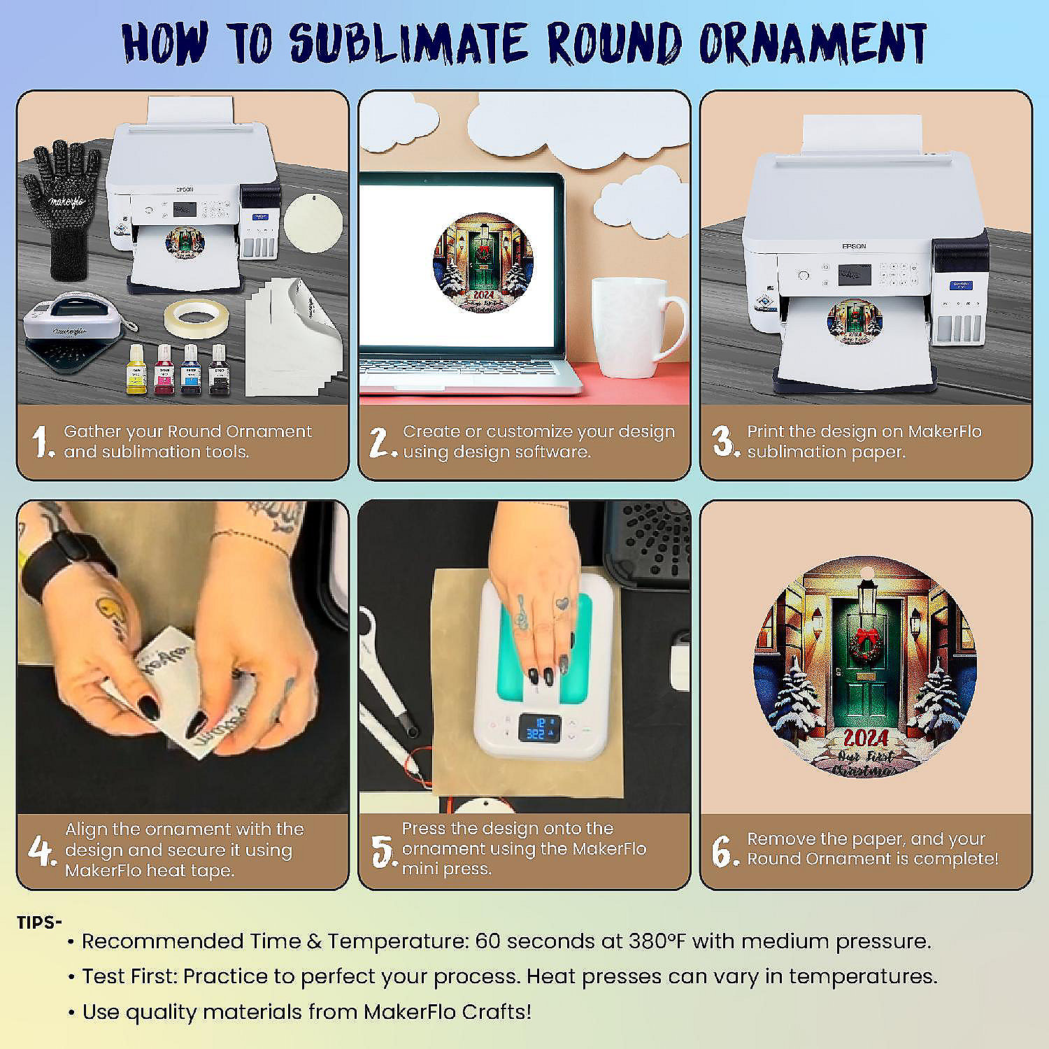Makerflo's Sublimation Round Ornaments are made from high-quality FRP (fiber reinforced plastic), offering exceptional durability and strength. These robust ornaments are designed to withstand the test of time and are perfect for creating personalized gifts or décor. Featuring a double-sided design, they provide ample space for vibrant sublimation printing on both sides. Each ornament comes with a festive red string for easy hanging. Measures 3.5" x 3.5". Sold in packs of 12 (72 per case). Recommended sublimation settings: 80 seconds at 380°F. Perfect for holidays, events, and DIY projects!
