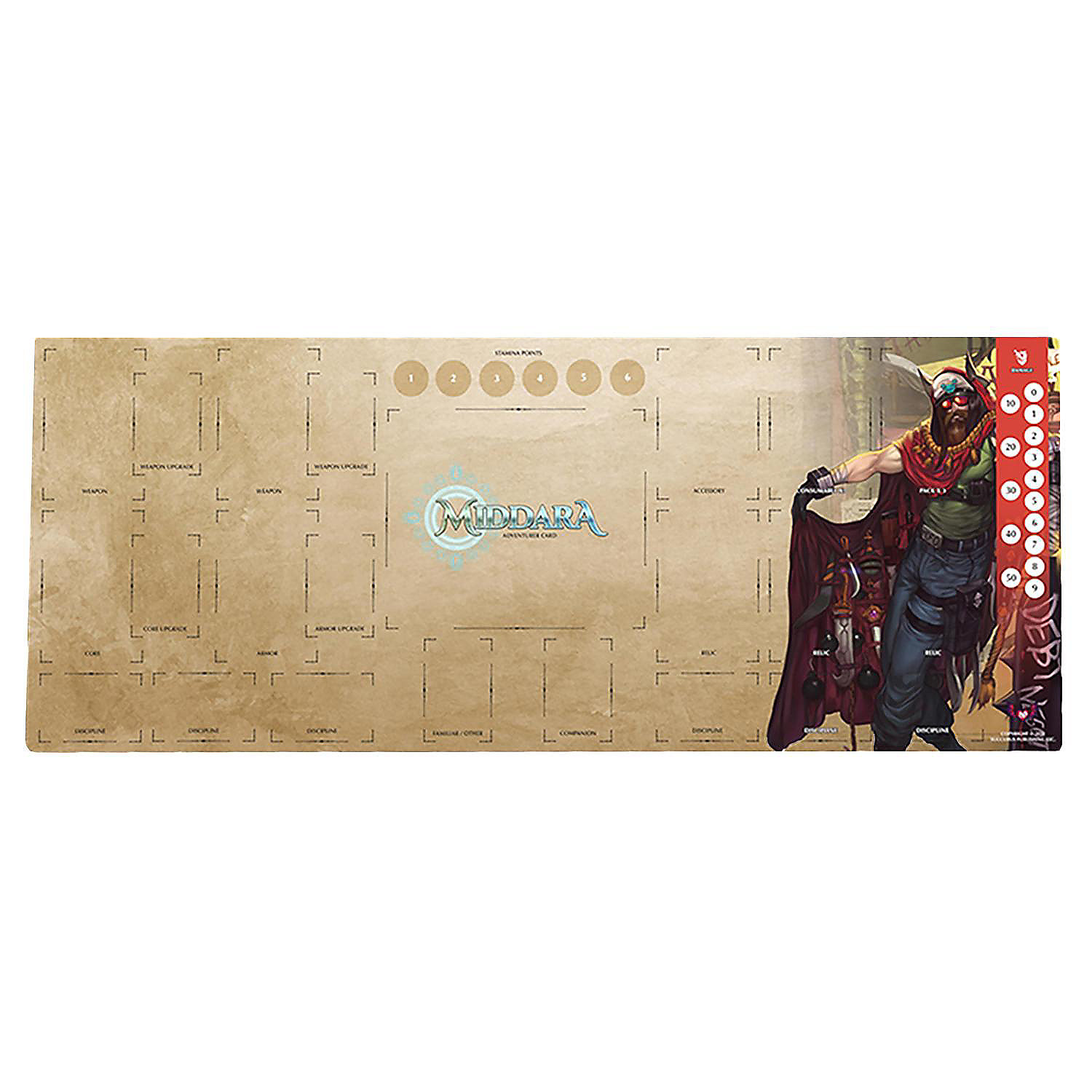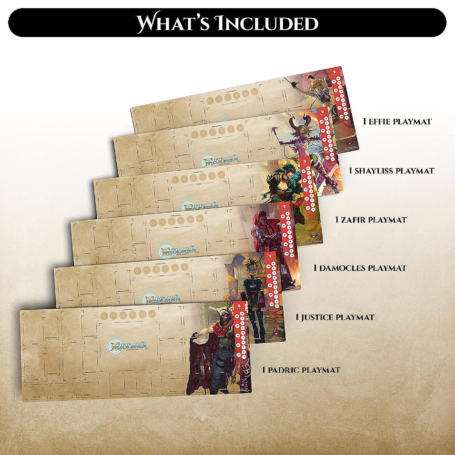 MIDDARA: ADVENTURER PLAYMATS PACK 2 (SET OF 6) - Keep track of your Stamina Points and your HP in style with our set of Adventure playmats. Each one of our six playmats depicts one of the six potential side characters and has all the necessary space required to use a full load-out of the average character build in Middara! The mat is made from high quality neoprene and features rubber backing to help keep the mat in place while you play. The stunning artwork will help take your game to the next level and give a more immersive experience. Keep your cards safe and show them off in style. EXPANSION PACK: This is an expansion to Middara: Unintentional Malum - Act 1. An epic narrative driven board game that is heavily inspired by JRPG tactics games. Alongside your friends, players embody one of many characters who traverse the world, defeat monsters, get loot, and level up. Together, you will make hard choices that change the fate of the characters and the world around them.