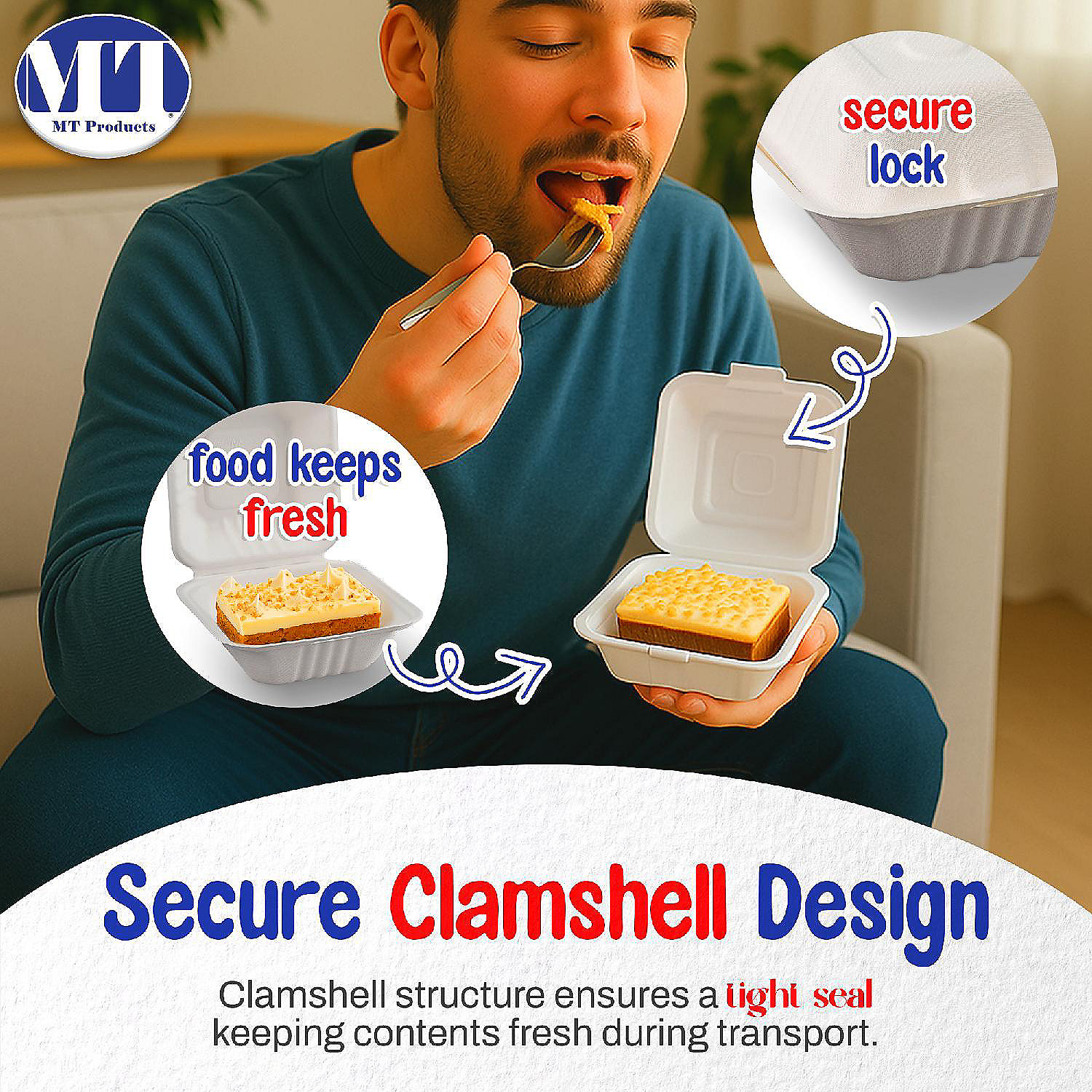 Complete any meal with MT Products' Molded Fiber Paper Bagasse food takeout clamshell containers food service to go boxes, practical and dessert to go containers ideal for anyone in the food industry, ensuring take out food box stays fresh and tasty with a secure tab and lock closure, grease and moisture-resistant cartons, and easy-closing lid for safe transport, also offering a microwave-friendly option for efficient reheating, These cake containers with lids are perfect for takeout's, and dispose it anywhere because this is a to go food containers disposable material.• Sleek and Stackable Design: Elevate your clamshell take out containers with lids on these sleek, stackable cake slice containers—perfect for transporting and maintaining your sweet creations.