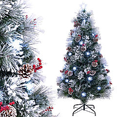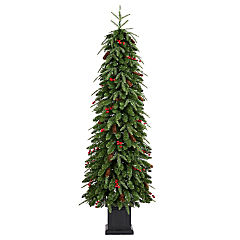 Glitzhome 6ft Pre-lit Green Artificial Christmas Porch Tree with red berries,pinecones and 180 warm white lights,3 function w/Foot Pedal