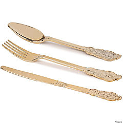 216 Pc. Shiny Metallic Gold Baroque Plastic Cutlery Set - Spoons, Forks and Knives (72 Guests)