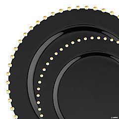 Black with Gold Pearl String Round Disposable Plastic Dinnerware Value Set - (120 Settings)