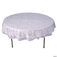 White Lace-Printed & Lilac Round Disposable Plastic Tablecloth Kit - 2 Pc.
