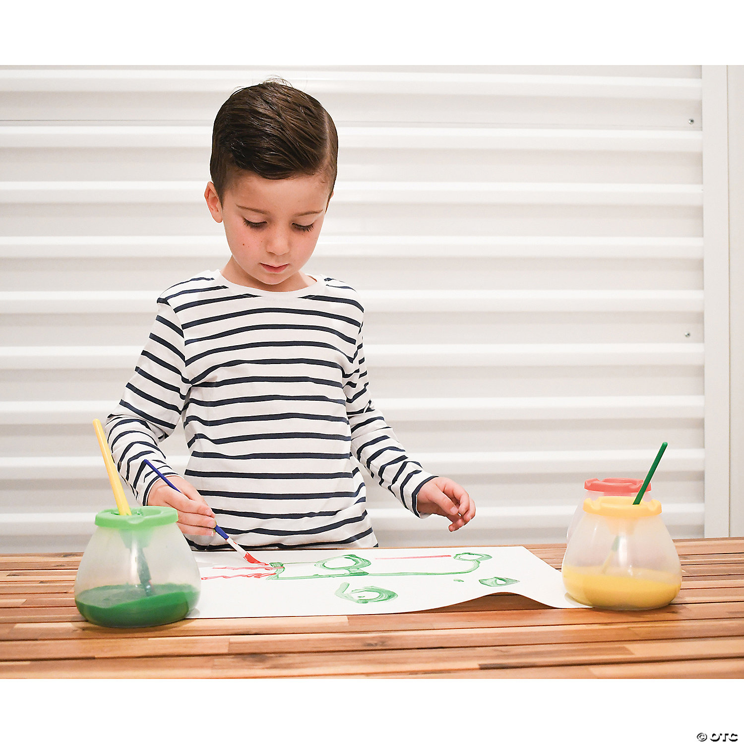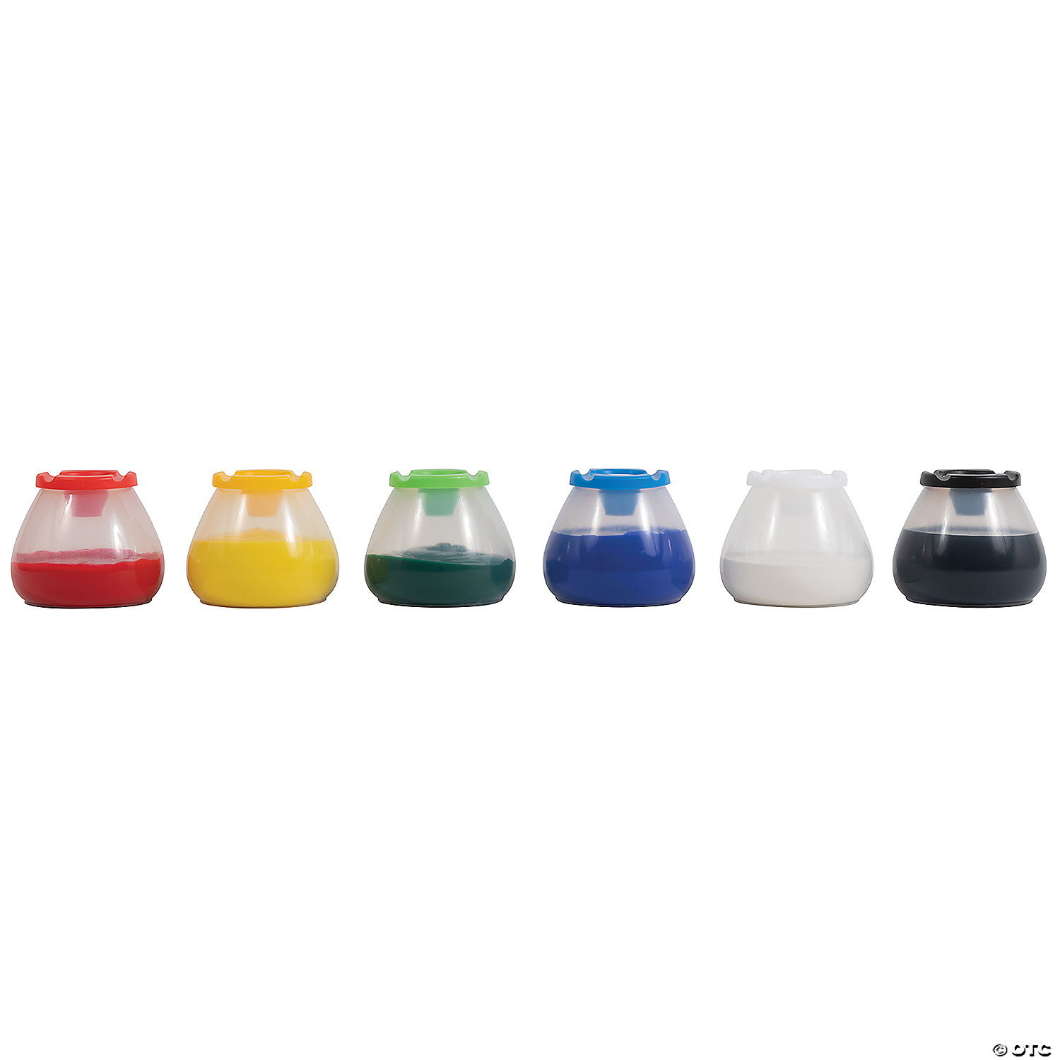 Designed for busy classrooms, these No Spill, No Tip Paint Pots are guaranteed not to spill when bumped! Their unique design includes a conical shape, where the bottom of the paint pot is wider than the top, which prevents them from tipping over. The pots are no spill, due to the narrow opening through which children place their paint brushes. Push-on lid includes a stopper, which covers the paint brush opening so paint won't dry out. Includes 6 paint pots with 6 different colored lids: red, yellow, green, blue, white and black. Size: 3.75"H x 3.5" (bottom) – 2.75" (top) dia. Special Shipping Information: Item ships separately from other items in your order. Item cannot ship to a P.O. Box, APO, FPO or PPO. Item is not eligible for expedited or international shipping. You may initiate a return for unused items within 30 days, if the items are in original packaging with all original materials included with the shipment.