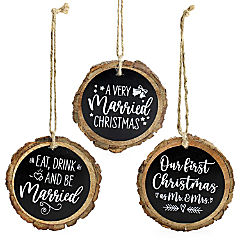 AuldHome First Married Christmas Ornaments (Set of 3); Wood Slice Chalkboard Style Rustic Holiday Decorations for Newlyweds and Wedding Gifts