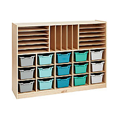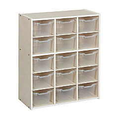 ECR4Kids Streamline 15 Cubby Tray Cabinet with 15 Scoop Front Storage Bins, 3x5, Natural, Clear