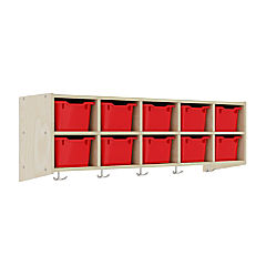 ECR4Kids Streamline 10-Section Hanging Coat Locker with Scoop Front Storage Bins, Natural, Red