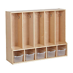 ECR4Kids Streamline 5-Section Coat Locker with Bench and Scoop Front Storage Bins, Toddler Size, Natural, Clear