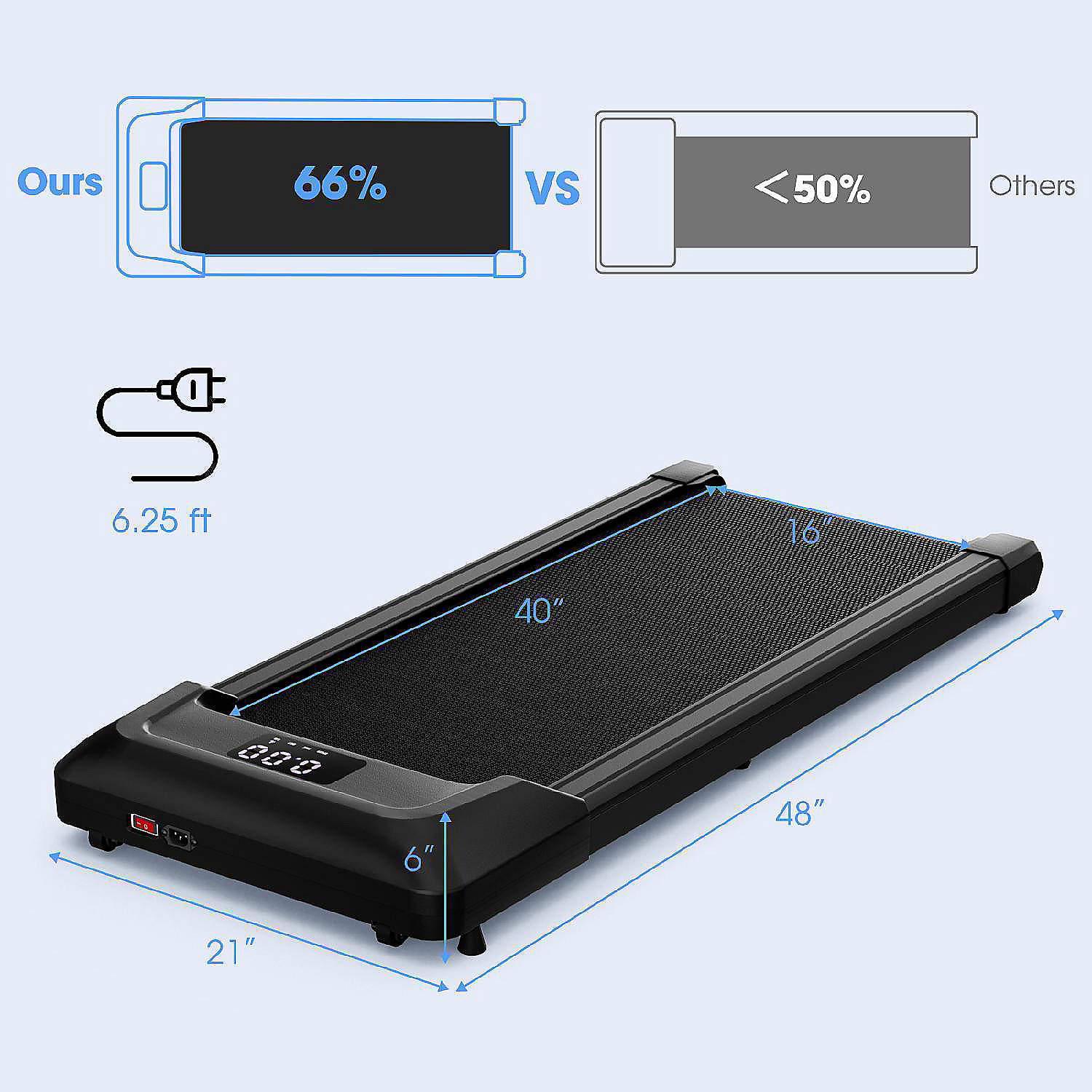 Our walking pad is a great investment for anyone looking to stay active and healthy while working or at home! Whether you prefer a flat surface or a challenging incline, this treadmill with incline can always accommodate your fitness needs. Then, the 7-layer non-slip running belt ensures your safety no matter whether you walk or jog between the 0.6-3.8 MPH speed range. The remote control will help you to adjust the speed. If you wanna track your progress, just look at the LED screen with speed, time, distance and calories display. With a high-quality 2.25HP motor, this walking jogging machine operates with low noise, generating less than 45dB during operation to ensure a quiet and peaceful workout environment, allowing you to focus on your tasks or entertainment while exercising. After using it, this under desk treadmill can be easily moved and stored for great convenience.