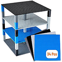 4 Pack Stackable Baseplates 10x10 in, 32x32 Studs, Compatible with Major Brands, 4 Plates & 30 Stackers, Black/Blue/Gray