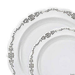 White with Silver Vintage Rim Round Disposable Plastic Dinnerware Value Set (120 Dinner Plates + 120 Salad Plates)