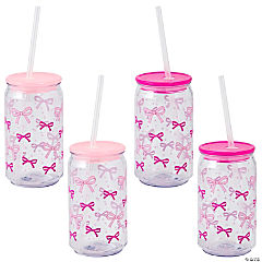 5 1/4" 16 oz. Pink Bow Plastic Reusable Cups with Lids & Straws – 4 Ct.