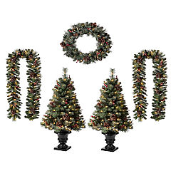 Glitzhome Set of 5 24"D Pre-Lit Glittered Pine Cone Christmas Wreath and Matched 9ft Garland Set and 4FT Porch Tree Set