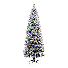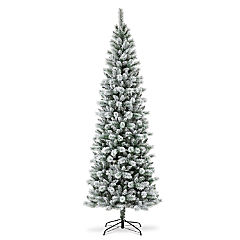 Costway 7FT Pre-Lit Snow Flocked Hinged Pencil Christmas Tree w/ 300 Lights & 8 Modes